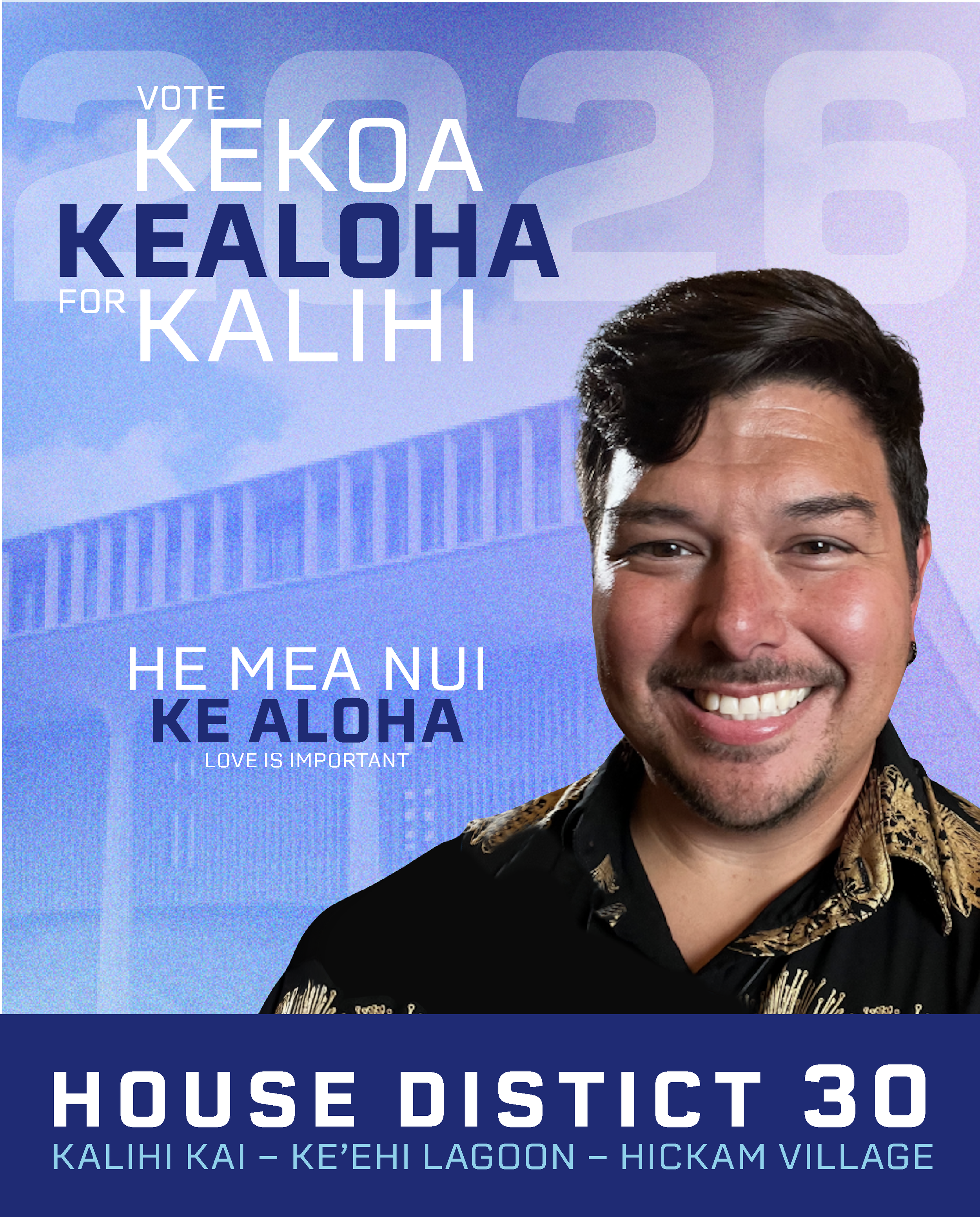 ʻAnoʻai ke aloha kākou! My name is Kekoaopololū (Kekoa) Kealoha, and I am running to represent District 30: Kalihi, Kalihi Kai, Keʻehi Lagoon, and Hickam Village.