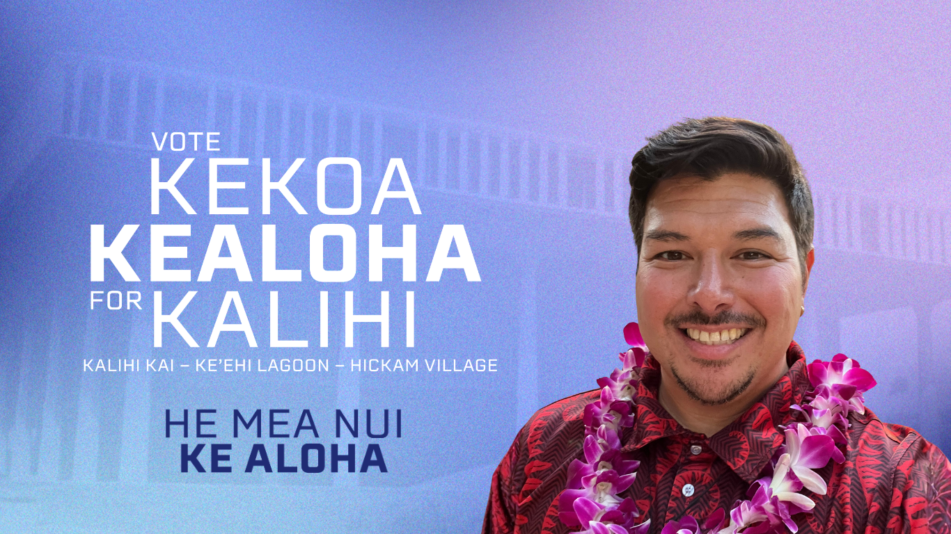 ʻAnoʻai ke aloha kākou! My name is Kekoaopololū (Kekoa) Kealoha, and I am running to represent District 30: Kalihi, Kalihi Kai, Keʻehi Lagoon, and Hickam Village.